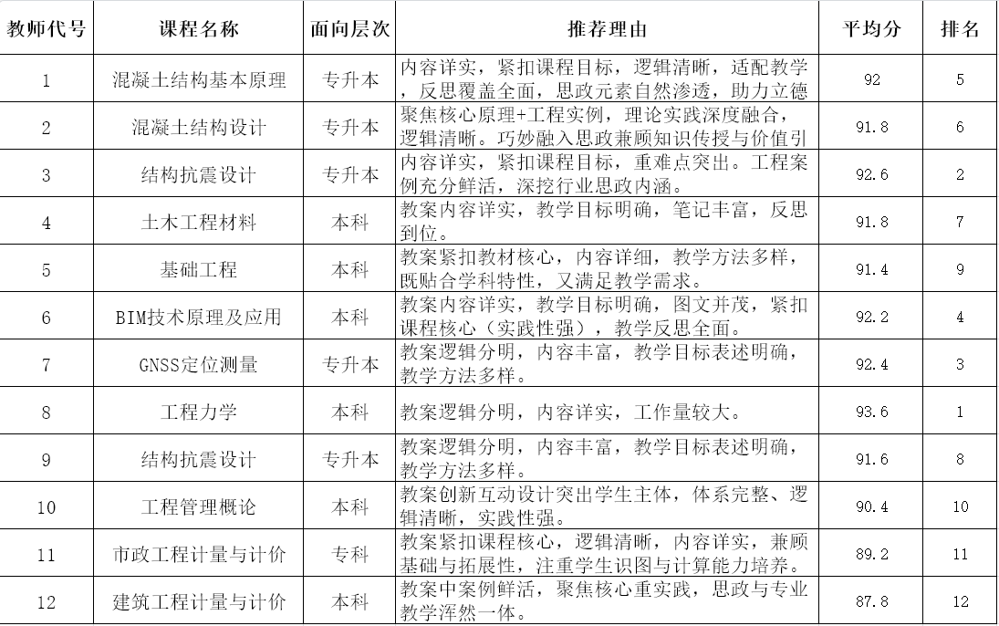 根据《关于举办建筑工程学院教案展示比赛的通知》要求,为提升教师教案设计水平、赋能高效课堂,经各教研室初选推荐、学院返聘教授终审评审,现将建筑工程学院 “精研教案设计・赋能高效课堂” 教案展示比赛结果予以公示。
