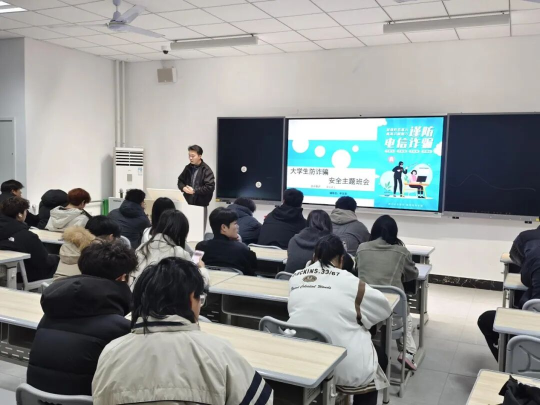 辅导员毕玉泽对全体学生进行专题安全教育。班会重点聚焦于防范电信网络诈骗,组织同学们观看了“大学生防诈骗警示录”等教育视频,展示了包括刷单返利、冒充客服等在内的高校多发诈骗案例,使同学们深刻认识到诈骗隐患近在咫尺,必须时刻保持警惕。会议特别强调,全体同学需安装并启用“国家反诈中心”APP,坚决杜绝线上陌生转账,做到不轻信、不透露、不转账,切实守护个人财产安全,共同营造安全的校园环境。