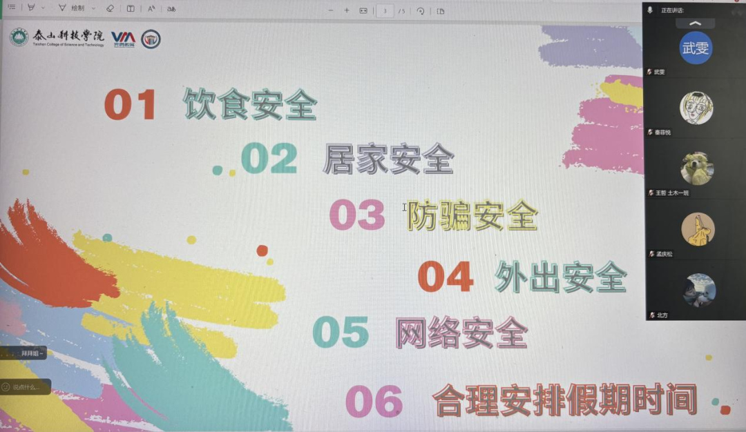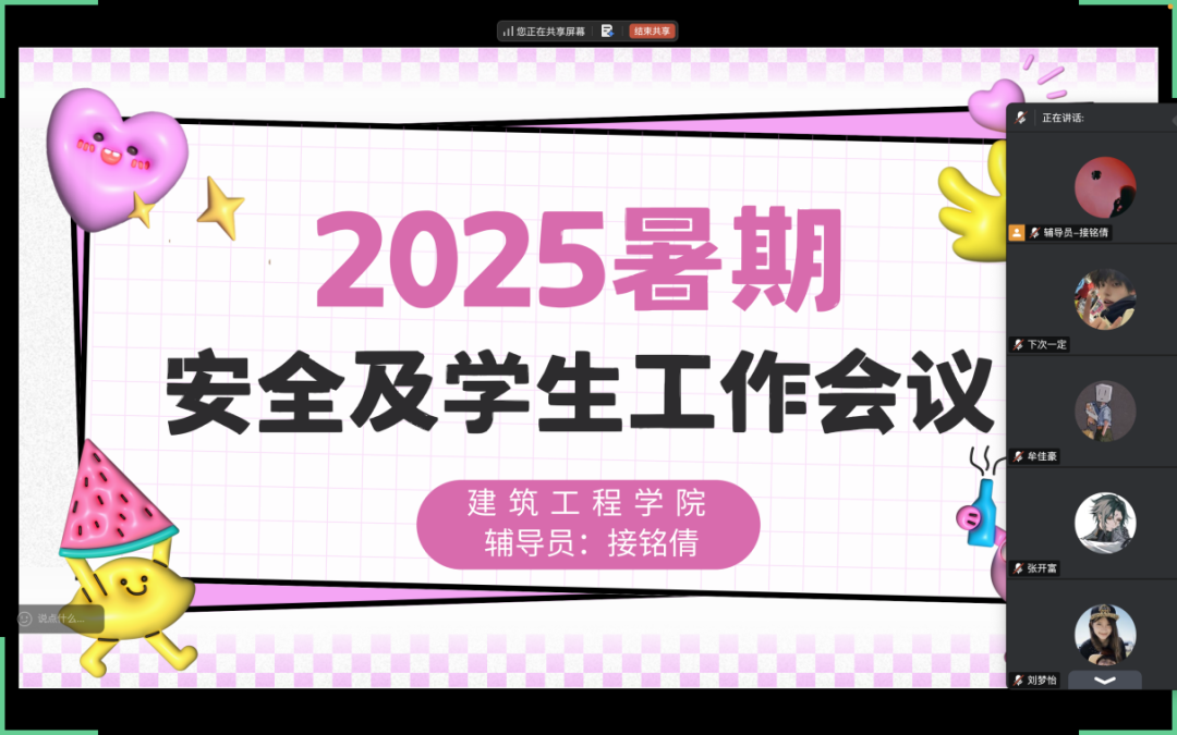 辅导员方艺组织召开了暑期安全教育线上班会。会上,方老师首先带领大家重点回顾了近期频发的典型安全事故案例,随后围绕暑期安全防护的多个关键领域展开了详细讲解,内容涵盖防溺水安全知识的普及、个人信息安全防范要点、日常出行安全注意事项以及心理健康维护技巧等。方老师指出,新学期开启后同学们将获得“应届毕业生”身份,结合就业市场的实际情况剖析了就业形势,鼓励大家积极把握招聘机会,利用各类资源,合理调整就业心态与预期目标。
