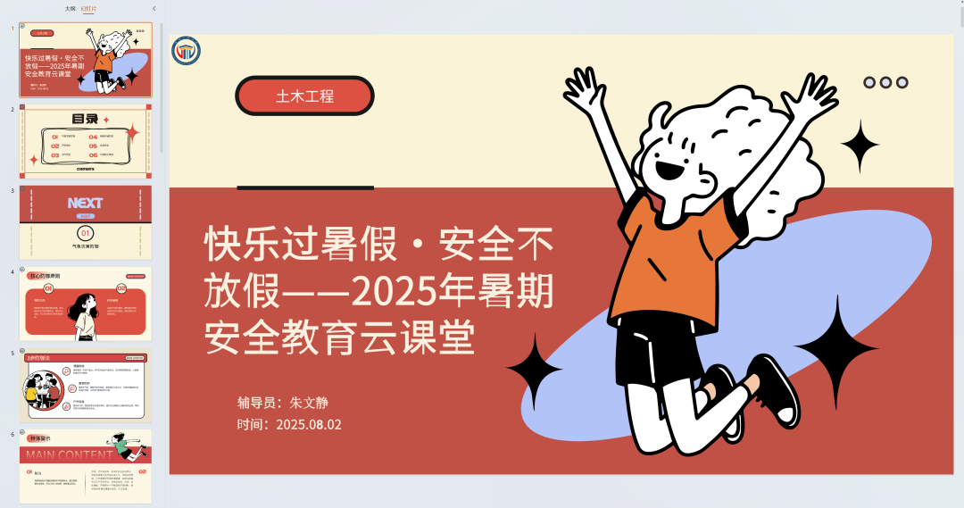 为深入贯彻落实立德树人根本任务,切实将学生安全放在教育工作首位,以扎实举措守护学生身心健康与生命安全,确保每位同学度过一个平安有序、富有意义的假期,建筑工程学院于近日组织开展线上暑期安全教育主题班会,由各辅导员主持,全体学生线上参与。