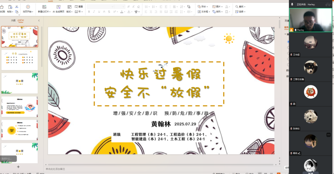 辅导员赵子璇面向2024级建筑工程技术(专)与智能建造技术(专)专业学生,召开了主题为“假期勿松懈 安全伴我行”的线上专题教育会议。此次会议通过腾讯平台开展,聚焦于暑期常见的安全风险,结合实际案例为同学们上了一场内容丰富、警示性强的安全教育课。本次会议聚焦假期高发的风险点,围绕“防汛防灾、防溺水、交通安全、网络防骗、食品安全、旅游风险”这六大板块展开。赵老师以近期校园周边的典型案例为切入点,借助 PPT 图文展示以及播放视频短片的方式,助力学生直观地了解身边存在的安全隐患。在气象灾害防范部分,介绍了汛期应对突发天气的策略,着重强调“非必要不前往山地、水边、临崖区域”。针对溺水问题,通过“警示一刻钟”环节讲述了大学生溺水事件,强调“不私自下水、不擅自施救”的原则。特别针对暑期兼职与实习诈骗现象进行讲解,还原诈骗话术,并指导学生下载使用国家反诈中心 APP。最后,提醒学生合理规划假期,注重心理健康调适,倡导健康的假期生活方式。