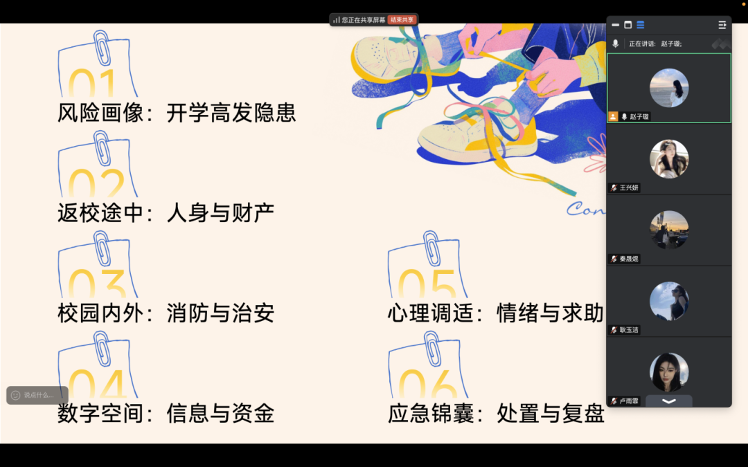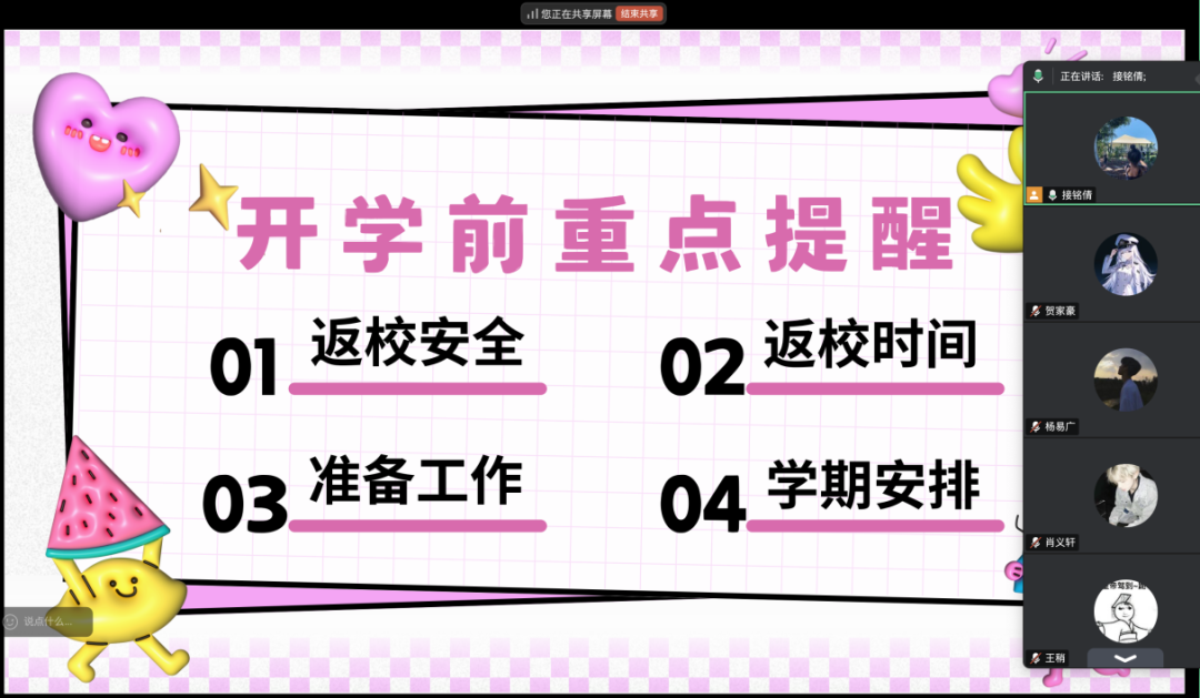 辅导员接铭倩面向23级学生开展线上安全教育主题班会,围绕“返校安全、返校时间、准备工作、学期安排”展开。首先,她强调返校安全,提醒防范电信诈骗、注意交通安全,要求家校联络畅通;其次,明确返校时间和上课安排,提醒部分学生补考,严禁无故延迟返校;接着,细化摸排学费缴纳、宿舍整改等准备工作;最后,初步解读学期安排,为新学期平稳过渡奠定基础。