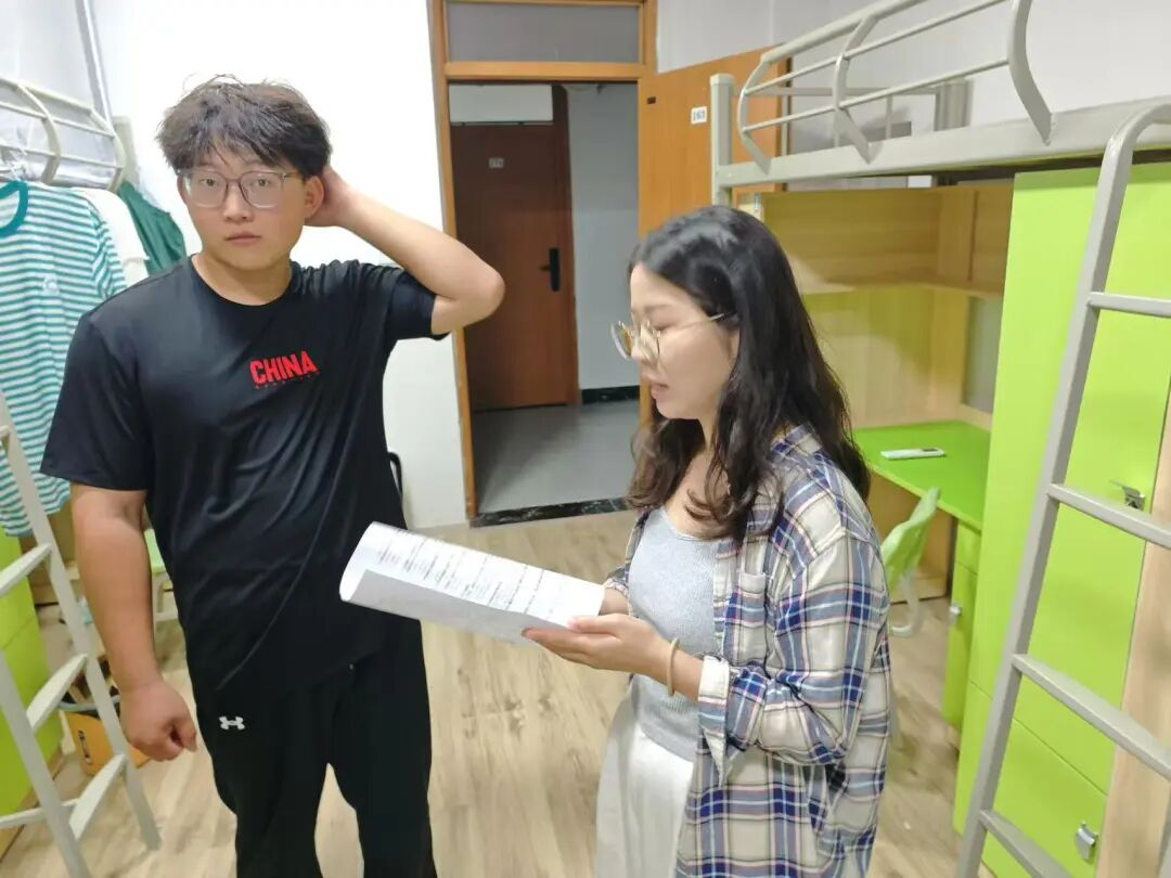 辅导员前往各新生宿舍,通过点名核对,统计每间宿舍实际入住人数,对临时外出的新生确认去向与返校时间做好详细记录。刘睿智副院长与新生亲切交流,询问他们的住宿适应情况、饮食是否习惯、是否还有什么困惑,面对新生提出的“校园网网速较慢出现卡顿”“热水器使用流程不熟悉”等问题,他当场记录,并安排相关负责人尽快协调解决,确保新生诉求“事事有回应、件件有着落”并叮嘱新生要尽快熟悉宿舍规章制度提高安全防范意识,尤其注意用电安全,坚决杜绝使用大功率电器。