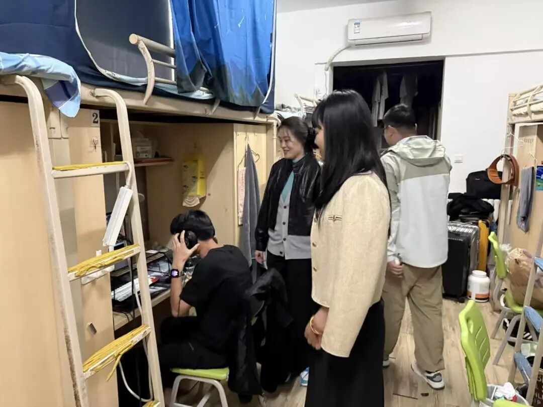 刘玫秀老师带队开展宿舍走访工作,重点排查安全隐患,发现并制止多起违规使用大功率电器、私拉电线及消防通道堆放杂物现象,同时强调插线板串联使用的风险,对卫生死角及物品收纳提出整改要求,对优秀宿舍给予表扬,对脏乱差宿舍下发整改通知。刘老师还深入关怀学生,询问毕业生就业情况,解答学业规划疑问,结合天气变化提醒预防感冒,建议加强通风和体温自查。通过奖惩结合促进宿舍文明建设,整体提升了学生安全意识和集体归属感。