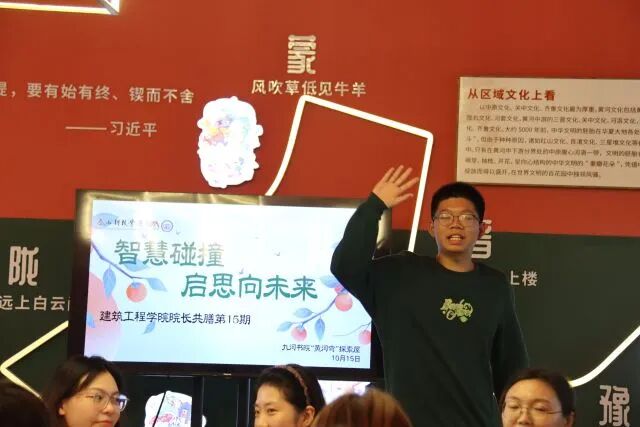 10月15日中午,建筑工程学院团总支学生会·学习部在九河书院黄河弯“探险屋”举办了以“智慧碰撞 启思向未来”为主题的院长共膳。本次共膳活动邀请到了建筑工程学院院长刘然慧、副院长达世安、院长助理唐迪、教学秘书王楚然、建筑结构教研室主任王春莉、工程管理教研室主任韩澎涛、建筑施工教研室主任赵鹏、工程造价教研室主任石小冬、团总支书记朱文静及辅导员刘玫秀。同时,也特别邀请了国奖获得者范承尧同学分享他在泰科的经历与得奖之路。
