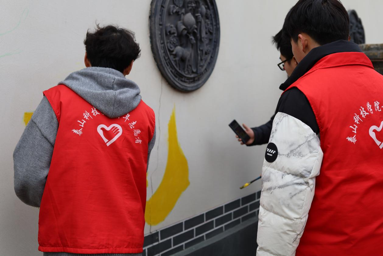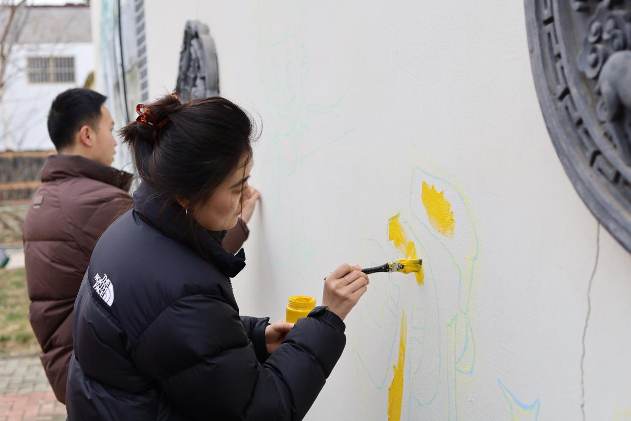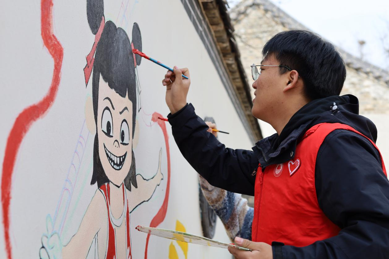 随着与小朋友的聊天,志愿者们也开始了手头的工作。志愿者们分工明确,各司其职,负责勾勒哪吒轮廓的毕老师,微微眯起眼睛,手中握着细细的炭笔,眼神专注而坚定,视线在参考图与墙面之间来回移动,生怕错过任何一个细节,笔下的线条流畅且精准,一点点勾勒出哪吒矫健的身形。几名志愿者精心调配色彩,还有的则向周围好奇围观的村民耐心介绍活动的意义。调色盘在他们手中仿佛成了魔法宝盒,调出的色彩鲜艳而和谐。手中的画笔犹如被赋予了魔力,在墙壁上游走、勾勒。随着时间的推移,哪吒的形象逐渐在墙上清晰起来。威风凛凛的乾坤圈,以彩色颜料细致描绘,每一笔都饱含着对细节的执着,线条流畅,金属质感呼之欲出仿佛下一秒就能飞旋而出;飘逸灵动的混天绫,用红、橙色彩晕染,随风飘动的姿态被展现得淋漓尽致。再看哪吒那坚毅的眼神,通过细腻的笔触和色彩渐变,深邃的眼眸仿佛在凝视着远方,传递出无畏的勇气。路过的村民纷纷驻足,眼中满是赞叹,志愿者们用画笔,让神话人物跃然墙上,点亮了王林坡的角落。