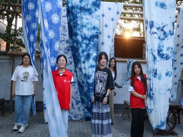 当正午的骄阳渐渐西斜,柔和的光线给村庄披上一层金色薄纱,下午时分,志愿者们带领同学们开启了探索王林坡的奇妙之旅。他们漫步在青石板路上,转角处,由志愿者们纯手工打造设计的‘建’染山林扎染工坊飘出的草木清香若有似无地牵引着众人脚步,仿佛在轻声诉说,这里藏着能将时光与记忆凝于布帛的神奇魔法。