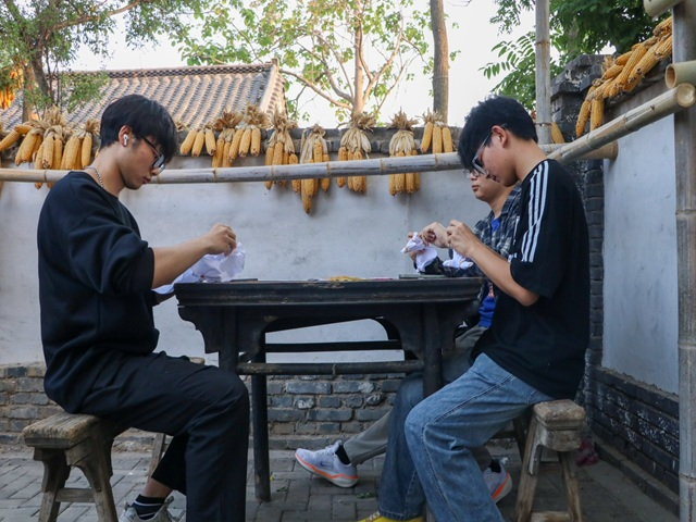 走进王林坡的扎染工坊,空气中浮动着草木染料特有的清香,古朴的木质长桌上整齐摆放着白布、彩线与染料,仿佛在诉说着古老技艺的魅力。同学们围坐桌边,在志愿者的耐心指导下,开始了奇妙的扎染之旅。有人将白布层层折叠,用皮筋仔细缠绕,扎出精致的花纹;有人大胆创新,尝试独特的捆扎手法。浸染、固色、晾晒,每一个步骤都充满期待。随着白布在染料中上下翻动,色彩渐渐晕染开来,当拆开缠绕的皮筋,一幅幅独一无二的扎染作品就此诞生。蓝白交织的图案,像是把云彩与溪流都定格在了布上,同学们捧着自己的作品,脸上洋溢着自豪的笑容,不仅收获了一份手作的乐趣,更与王林坡的传统工艺结下了深厚的缘分。