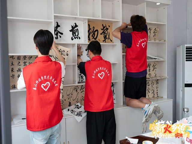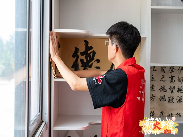 与此同时,“拓片工坊”其他成员们正踮脚仰头,专注地擦拭着房屋的玻璃。他们手持蘸满清洁剂的抹布,仔细抹去玻璃表面的灰尘与污渍,动作娴熟而利落。两处场地虽相隔较远,却同样跃动着青春的热情——一边是传统技艺在笔尖绽放,一边是窗明几净映出振兴希望,共同编织着乡村振兴的多彩图景。