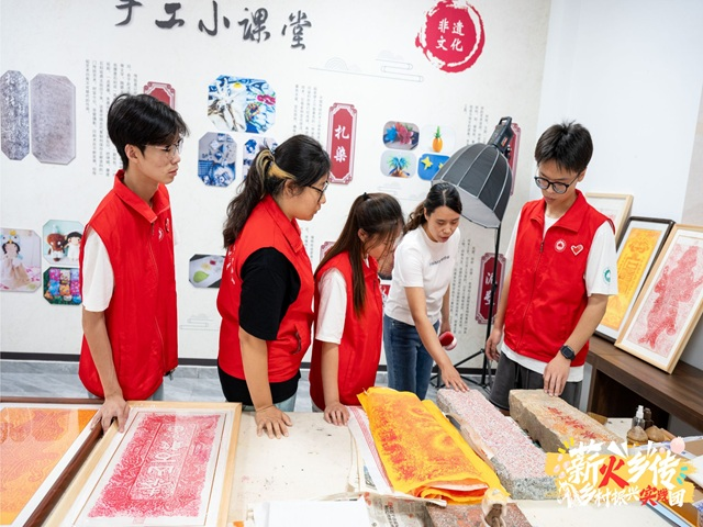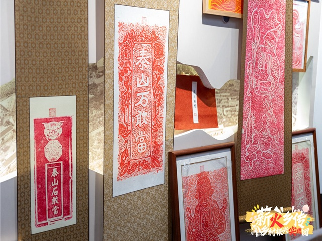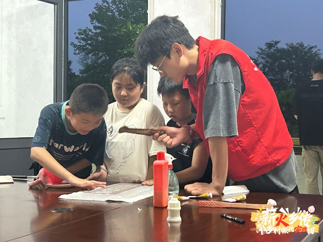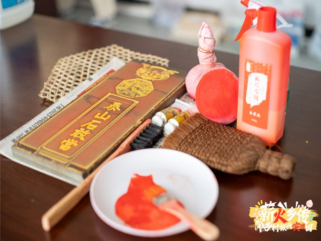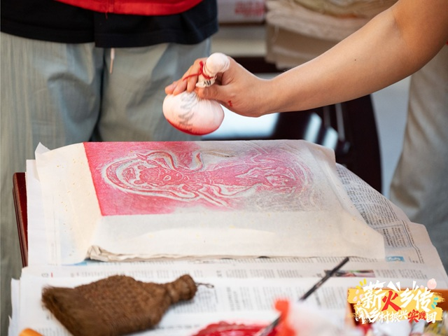 成员们学着将拓包浸入朱砂染料,在瓷碟边缘轻磕两下刮去多余颜料,随后将拓包垂直悬于纸面。随着手腕有节奏地起落,拓包与宣纸发出细密的“噗噗”声,鲜艳的朱砂红如同初升的朝霞,在纸面徐徐晕染开来。阳光下,让这位神话英雄仿佛被赋予了新的生命力。随着最后一笔收势,石板上的哪吒仿佛冲破次元壁,跃然纸上,既保留着传统拓染的古朴韵味,又因鲜艳的色彩与现代元素碰撞出别样活力。这些承载着神话传说的拓片作品,不仅是技艺的传承,更成为了传统文化与乡村振兴交织的生动注脚。