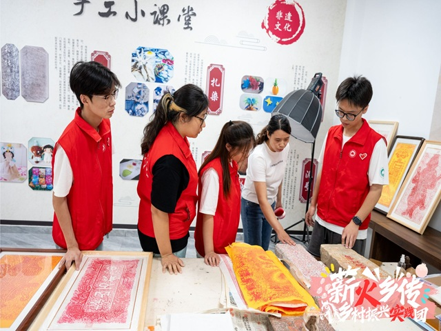 在改造过程中,成员们始终围绕“非遗与乡村共生”的初心。成员们跟着村委会老师学习拓印技艺,从喷洒清水让宣纸贴合石面,到用“轻起、重按、缓移”的手法拍色,看着朱砂红在纸上晕染出哪吒的鲜活形象,再将这些作品融入工坊装饰,让传统技艺真正成为空间的灵魂。