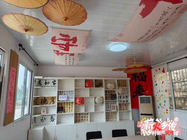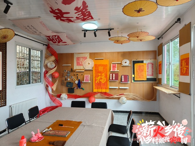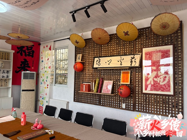改造后的空间兼具实用性与艺术感:墙面悬挂村民捐赠的毛笔字画,原木色雨伞与纱幔吊顶营造出江南烟雨意境,彩色竹条制作的打卡点成为亮点。特别设计的洞洞板既用于工具收纳,也作为拓片展示区。