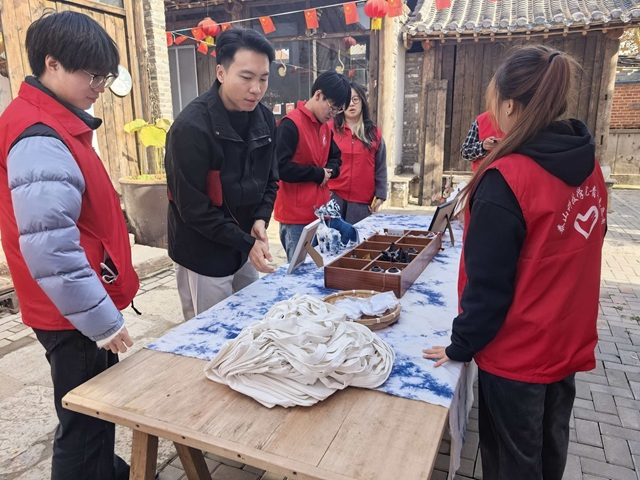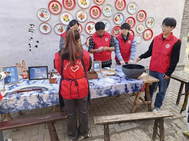 11月10日,王林坡村热闹开展扎染实践活动。来自建筑工程学院的志愿者们带着靛蓝染料、素色布包和捆扎工具,为前来参观的游客带来了一场沉浸式的非遗文化体验,以实际行动推动非遗活化传承,为乡村文化振兴注入动力。