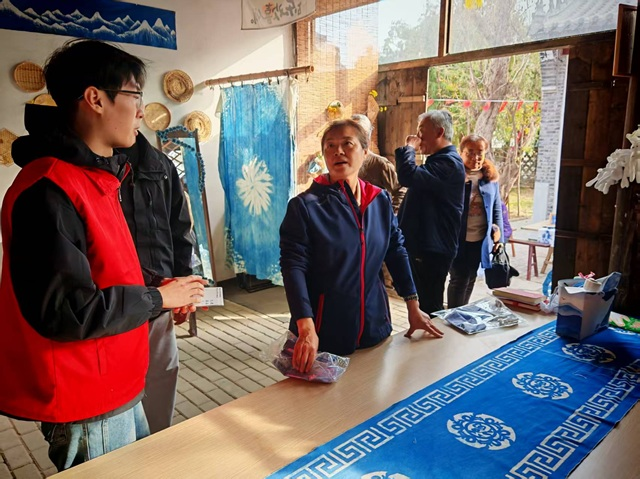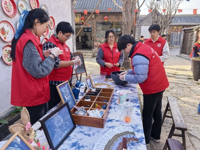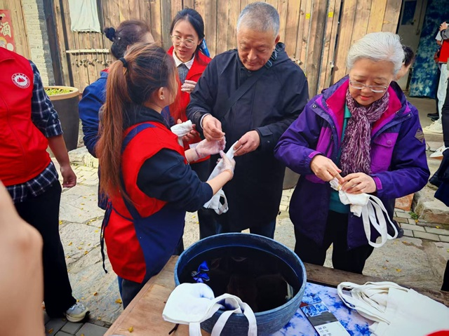 在志愿者的悉心指导下,游客们一步步完成布料捆扎、染料浸泡、清水冲洗、明矾固色等流程。当一件件带着独特花纹、散发靛蓝光泽的扎染布包呈现在眼前时,游客满脸成就感。“第一次亲手做扎染,过程简单却充满乐趣,真切感受到了扎染的魅力。”一位游客笑着说道。
