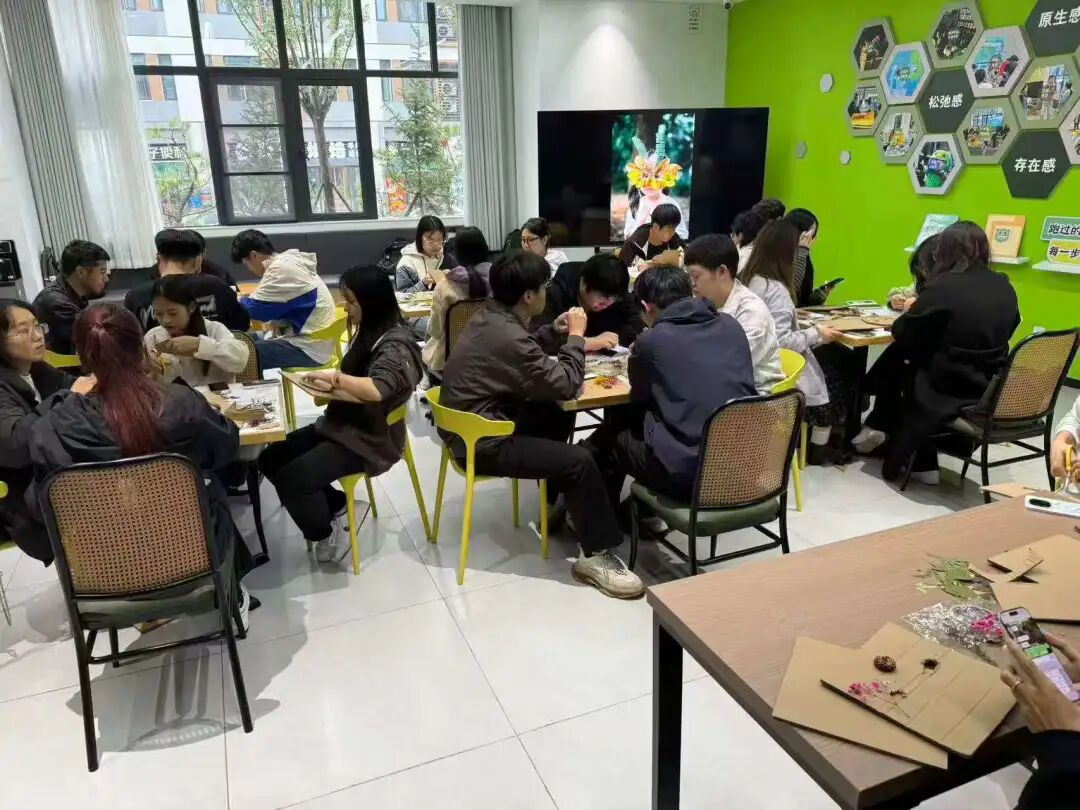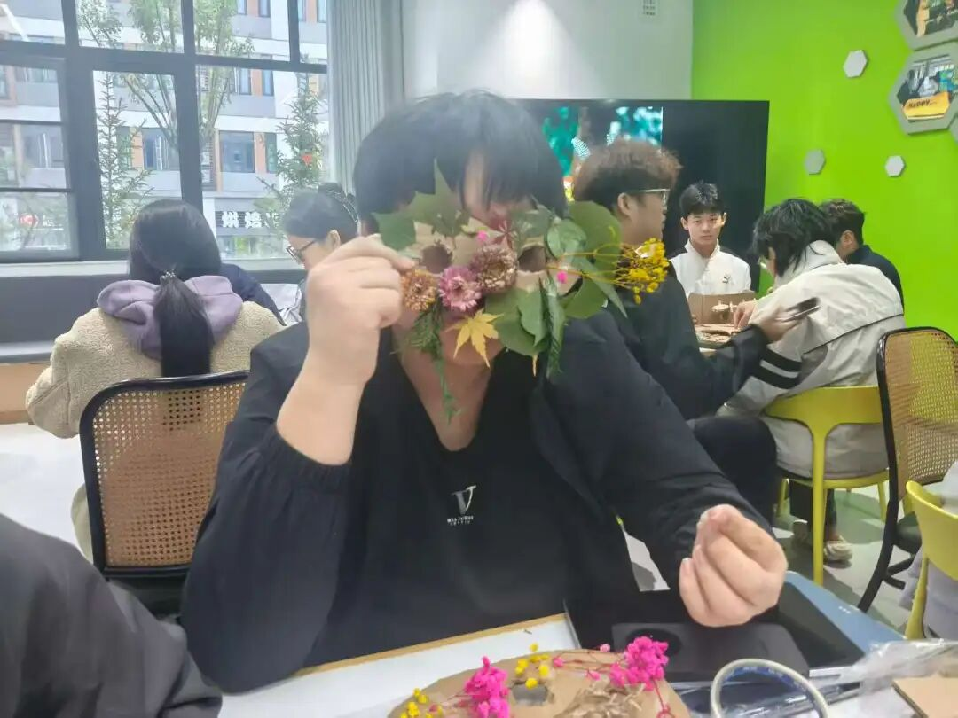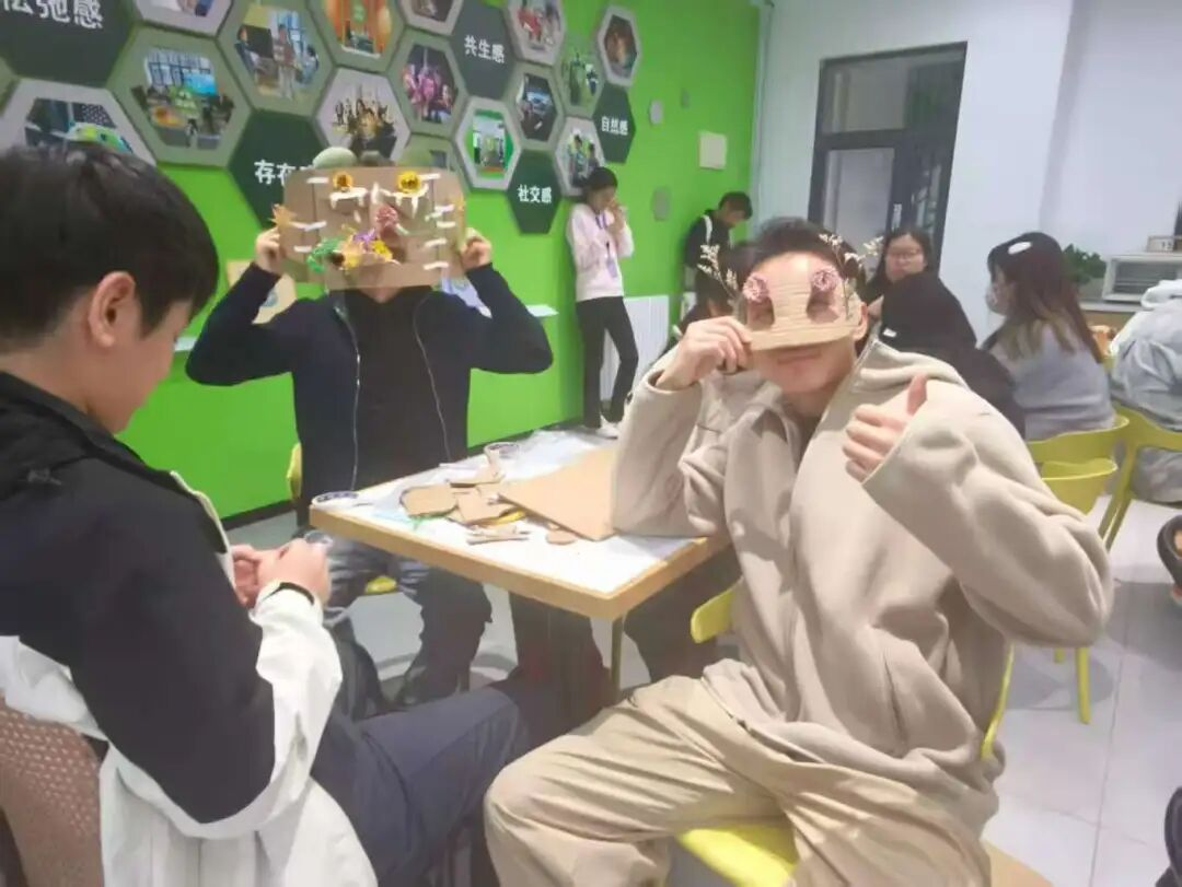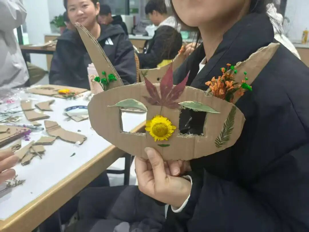 随着活动推进,一个个充满创意的面具也逐渐成型,原本互不相识的同学,因为对“情绪与植物”的共同表达,迅速拉近距离,毕老师在会场中穿梭,不时驻足与同学们交流创作心得,通过这样的活动,让学生用更直观、更感性的方式与自己的内心对话。