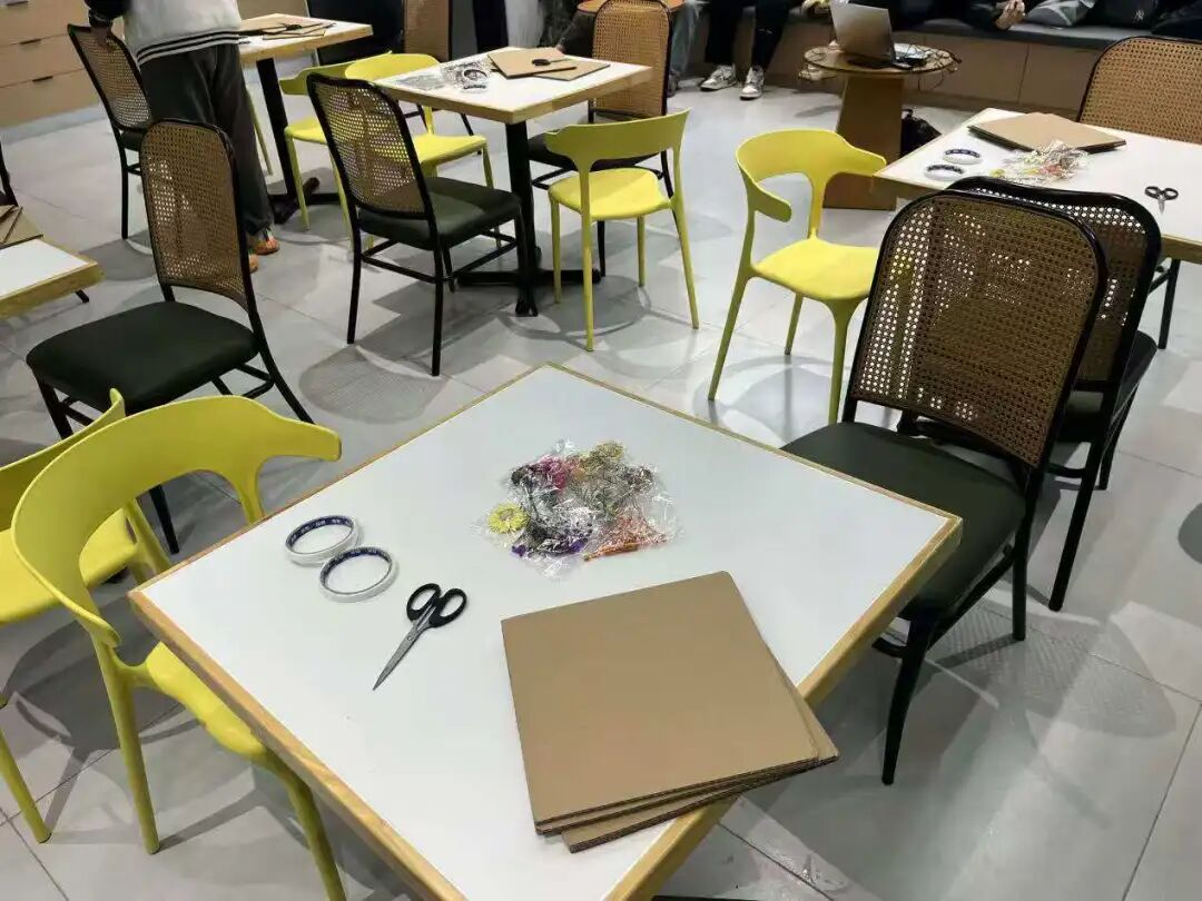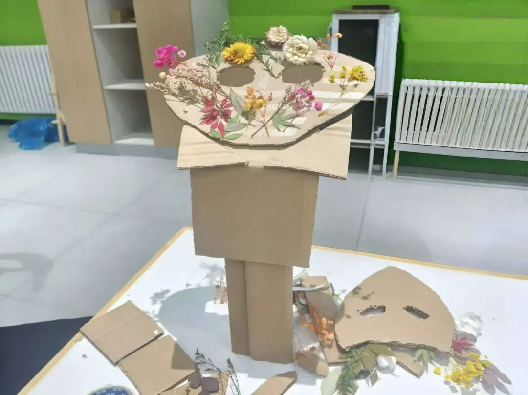 活动现场的长桌上摆放着制作面具所需要的材料,有风干后依然保持绿意的叶片、颜色依旧鲜艳的橙红的花朵,还有彰显自然气息的深褐的枯枝,每一份材料都带着阳光与泥土的印记。工作人员提前为同学们准备了空白的纸板,剪刀、双面胶等工具,并在屏幕上播放着创意案例——各式的面具样式映入眼帘,为初次尝试的同学提供灵感。