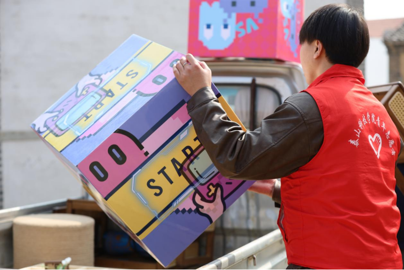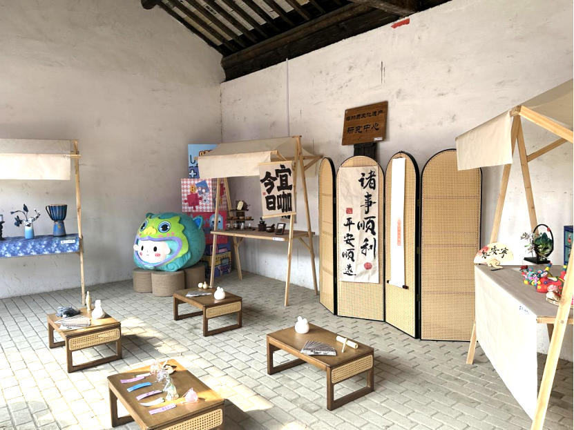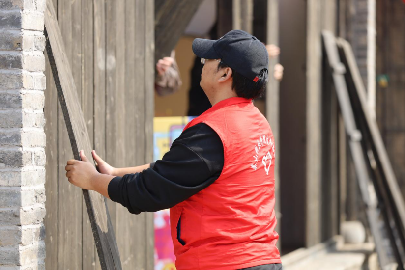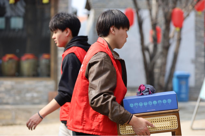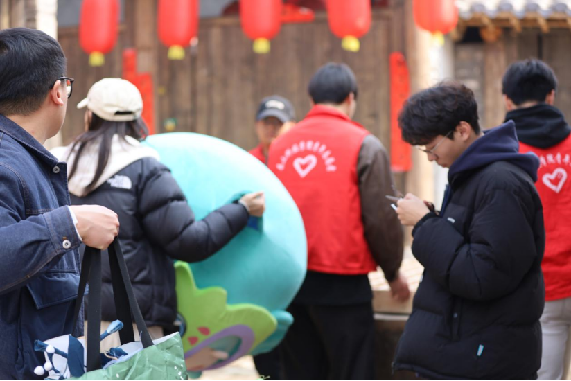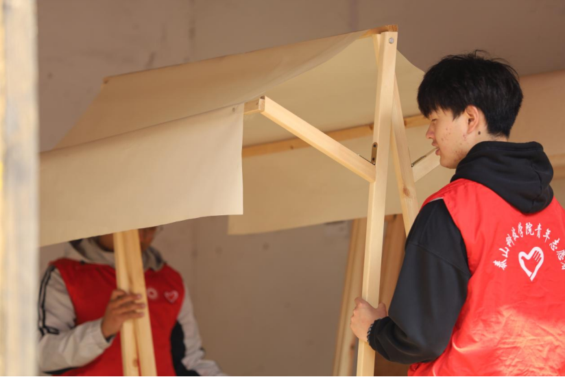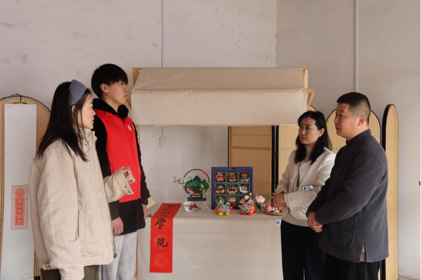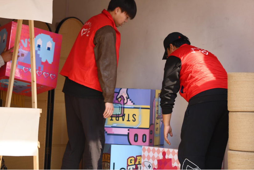 散发着古朴气息的房屋瞬间吸引了众人的目光,就连木屋的门,其独特形式也是志愿者们未曾见过的,充满了历史的韵味。在指导老师的有序安排下,志愿者们迅速投入到改造工作中。大家齐心协力,将学校非遗研究中心的作品以及敢当书院的吉祥物“石小敢”从运输车辆上卸下,随后开始精心布置屋内的摊位。