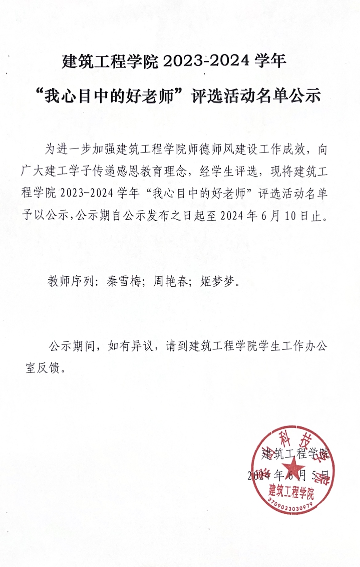 建筑工程学院2023-2024学年“我心目中的好老师”评选活动名单公示